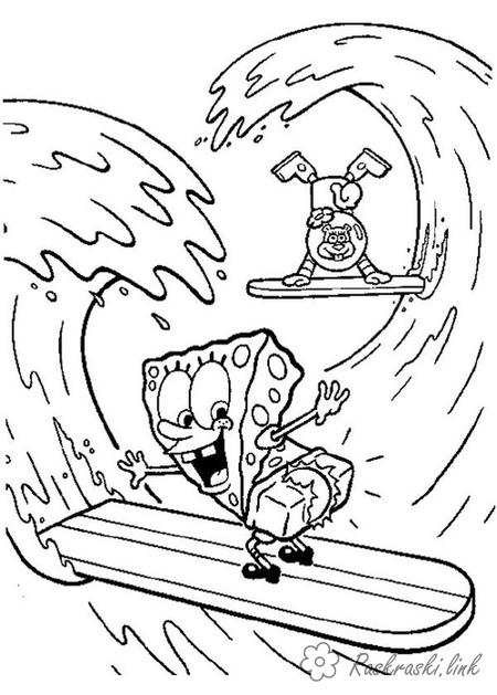 Раскраска Губка Боб, Сенді, серфінг, хвиля