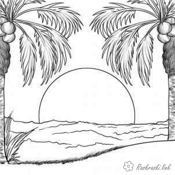 Раскраска Явища природи, захід, сонце, океан, море, пальми