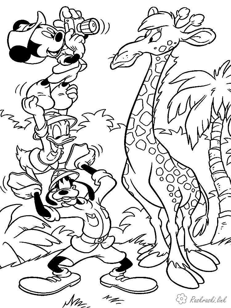 Раскраска розмальовки для дітей, тварини, Африка, жираф, Міккі Маус, Скрудж Магдак, Гуфі