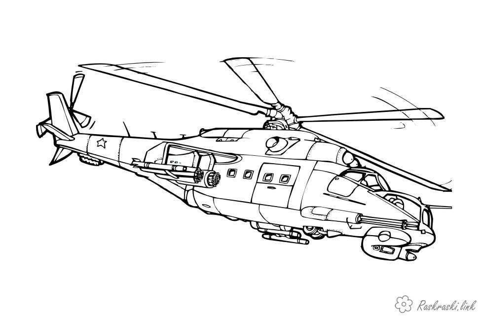 Раскраска Розмальовка, Вертоліт бойової, Вертоліт з ракетами, Вертоліт з гарматами, Військовий вертоліт Росії.