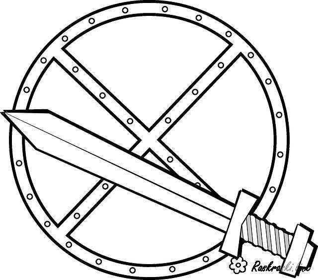 Раскраска розмальовки для дітей, щит, меч, зброя, давня зброя