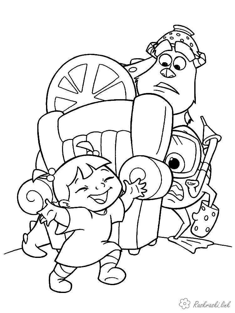 Раскраска Корпорація монстрів, монстр, дитина, дівчинка, Бу, Саллі, Салліван, Джеймс, Майкл, вазівська, крісло