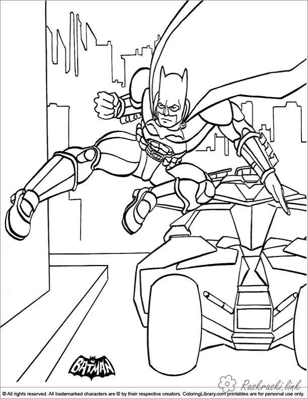 Раскраска розфарбування бетмен і бетмомобіль, супергерої