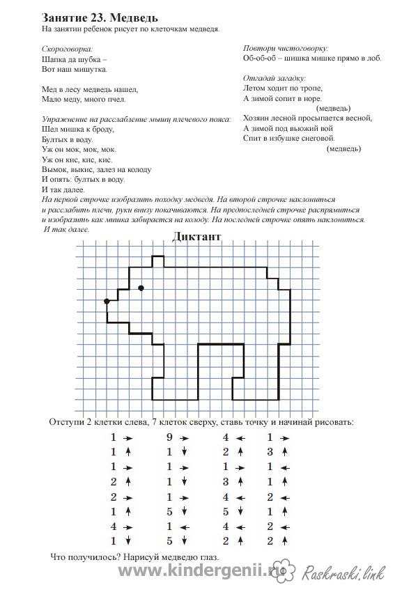 Ви знаходитесь в категорії розмальовки Графічний диктант. Розмальовка яку ви розглядаєте описана нашими відвідувачами наступним чином "Графічний диктант, малюємо по клітинках ведмедя" Тут ви знайдете безліч розмальовок онлайн. Ви можете завантажити розмальовки Графічний диктант і так само роздрукувати їх безкоштовно. Як відомо творчі заняття відіграють величезну роль у розвитку дитини. Вони активізують розумову діяльність, формують естетичний смак і прищеплюють любов до мистецтва. Процес розфарбовування картинок на тему Графічний диктант розвиває дрібну моторику, посидючість і акуратність, допомагає дізнатися більше про навколишній світ, знайомить з усім розмаїттям кольорів і відтінків. Ми щодня додаємо на наш сайт нові безкоштовні розмальовки для хлопчиків і дівчаток, які можна розфарбовувати онлайн або завантажити і роздрукувати. Зручний каталог, складений за категоріями, полегшить пошук потрібної картинки, а великий вибір розмальовок дозволить щодня знаходити нову цікаву тему для розфарбовування.