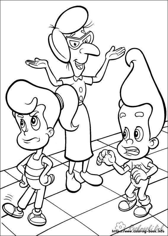 Джиммі, Сінді і вчителька. Раскраска розмальовки мультфільми, Nickelodeon розмальовки, Джиммі Нейтрон, Сінді, дівчинка, хлопчик, бабуся, вчитель завантажити бесплатно онлайн