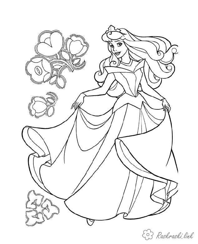 Попелюшка на балу в короні. Раскраска попелюшка, бал, корона, плаття, квіти завантажити бесплатно онлайн