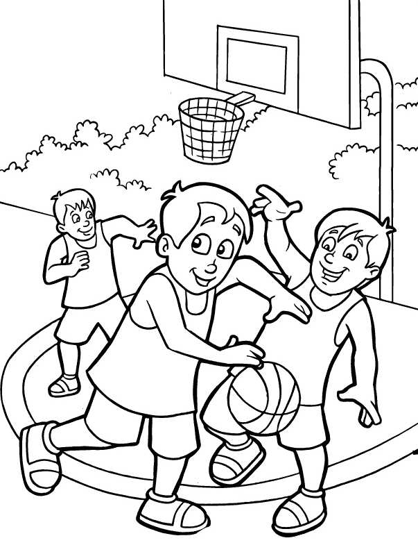 грають на вулиці в баскетбол. Раскраска вулиця, кущі, баскетбол, гра завантажити бесплатно онлайн