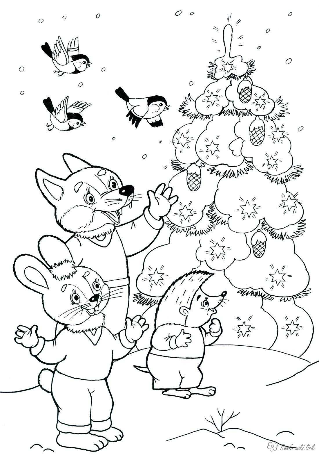 розфарбування для дітей "На Ялинці". Раскраска Дитяча новорічна розфарбування, звірі біля ялинки завантажити бесплатно онлайн