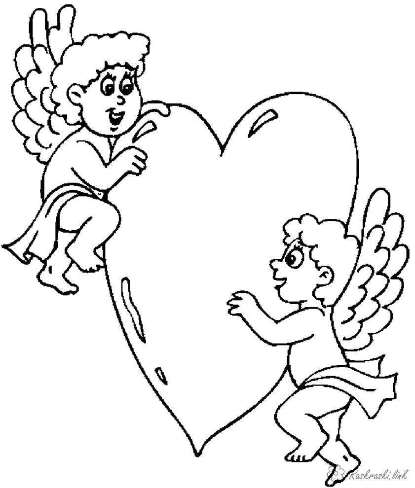 Ангелочки с сердцем. Раскраска День Святого Валентина, сердца, ангелочки завантажити бесплатно онлайн