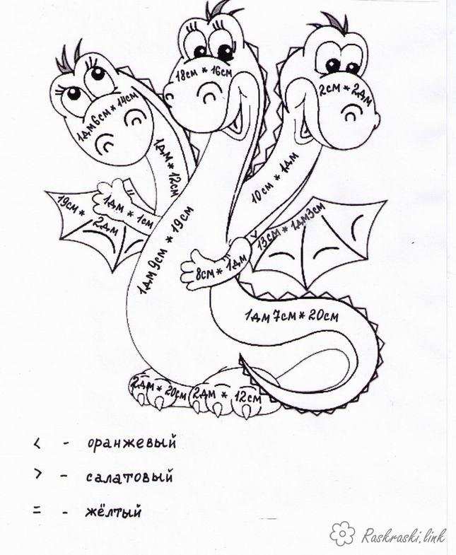 Вгадай значення і розфарбуй дракона. Раскраска математичні розмальовки для дошкільнят, навчальні розмальовки, вгадай значення і розфарбуй, дракон завантажити бесплатно онлайн