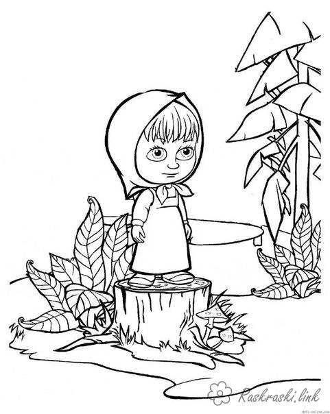 маша стоїть на пенечке. Раскраска розфарбування маша і ведмідь, пеньок, дерева, для дітей завантажити бесплатно онлайн