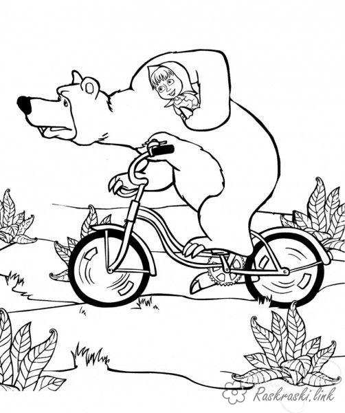 миша і маша на велосипеді. Раскраска розфарбування маша і ведмідь, велосипед, ліс завантажити бесплатно онлайн