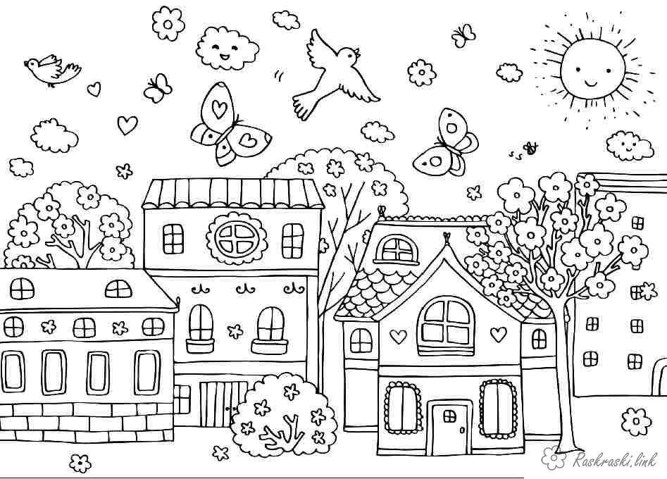 весна в городе. Раскраска весна в городе, весенняя раскраска завантажити бесплатно онлайн