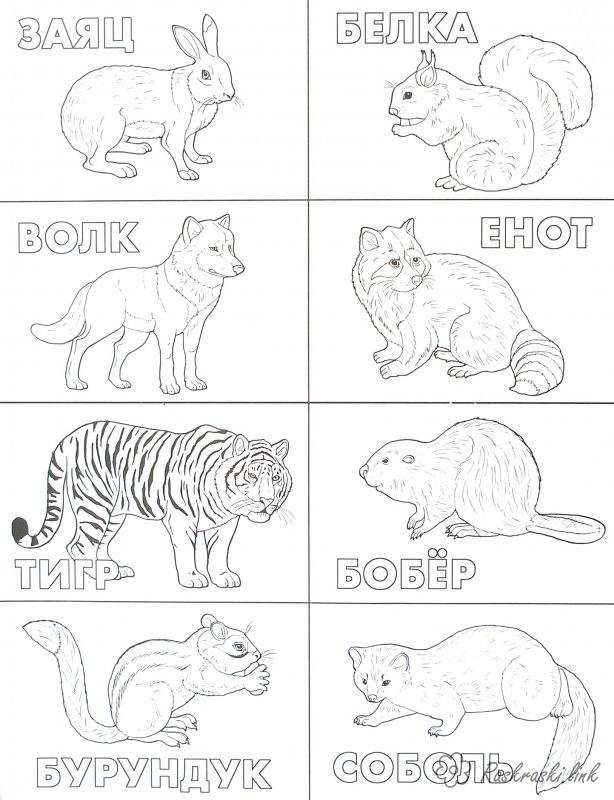 Розмальовка дикі тварини з підписами. Раскраска Розмальовка тварини, дикі тварини, розфарбування заєць, білка, вовк, тигр, бурундук, соболь, єнот, бобер завантажити бесплатно онлайн