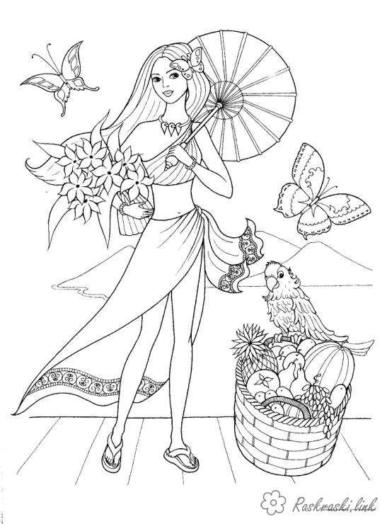 Красива дівчина на відпочинку. Раскраска Дитячі розмальовки, природа, відпочинок, відпочинок на природі, дівчинка, дівчина, дівчинка з парасолькою, папуга, метелики завантажити бесплатно онлайн