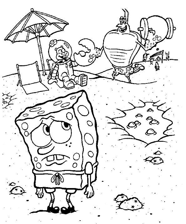 Губка Боб на пляжі з Сенді і крабом. Раскраска Губка Боб, пляж, Сенді, парасолька завантажити бесплатно онлайн