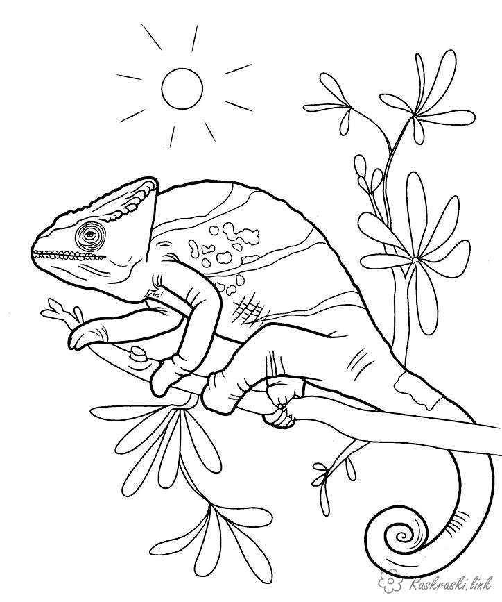 хамелеон гріється на гілці. Раскраска розмальовки, хамелеон, реплтіліі завантажити бесплатно онлайн