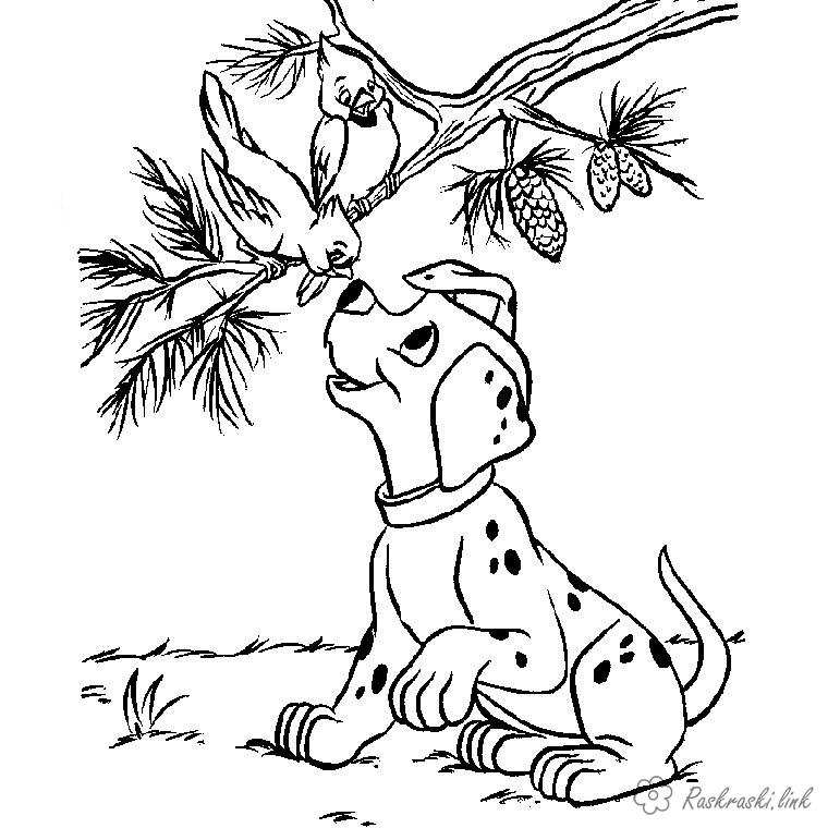 Далматинець і пташеня на гілці. Раскраска далматинець, пташеня, дерево завантажити бесплатно онлайн