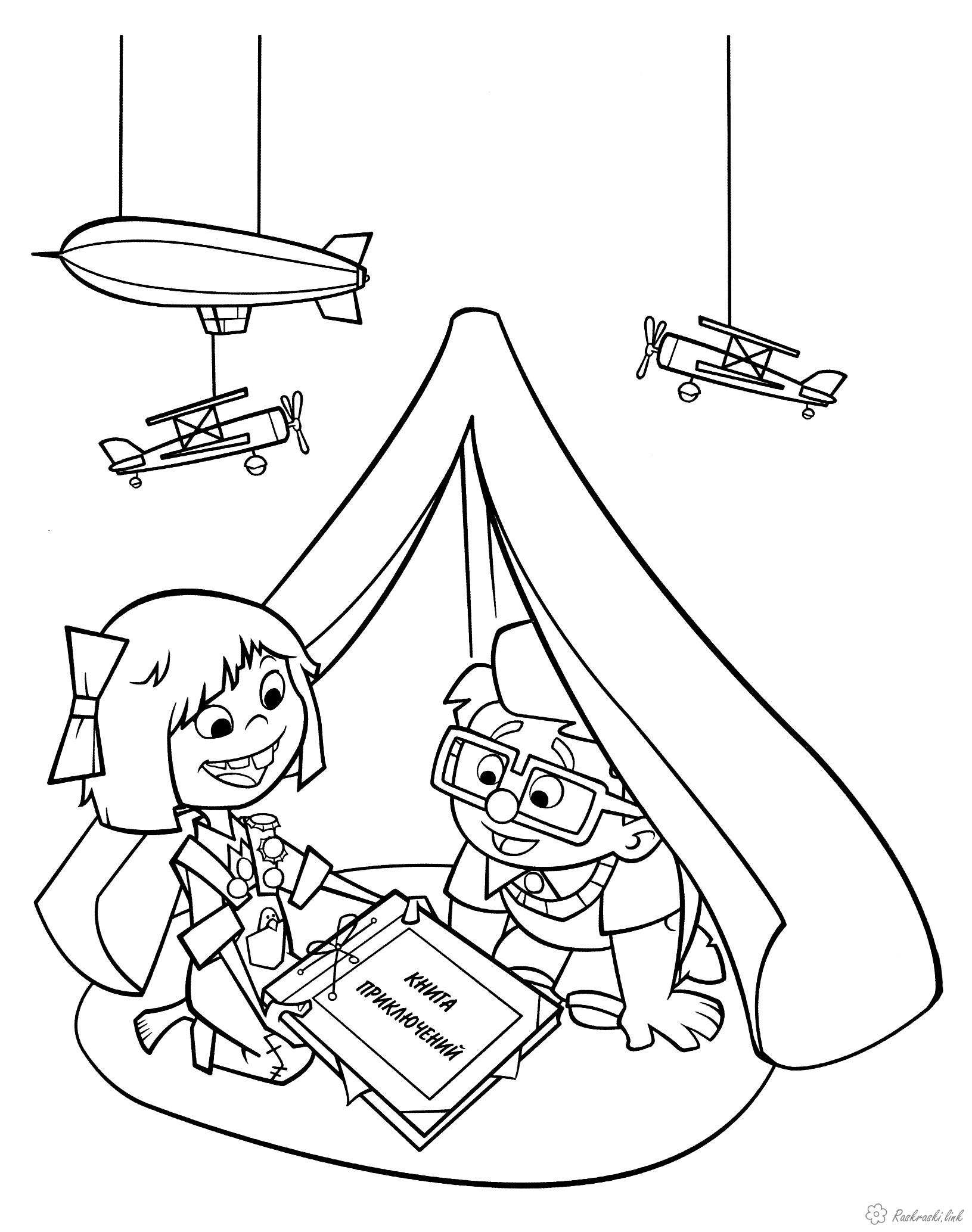 Розмальовка діти Еллі і Карл мріють. Раскраска Мультфільм, Вгору, діти, дитина, хлопчик, дівчинка, Еллі, Карл, мрія завантажити бесплатно онлайн