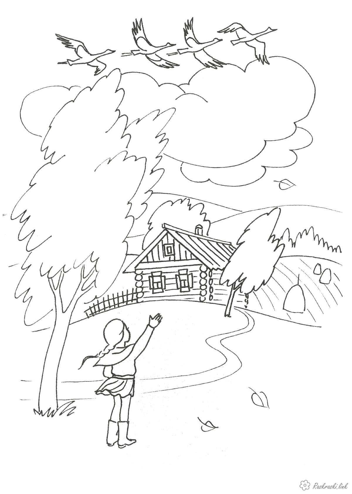 Розмальовка за мотивами казки "Гуси -лебеді". Раскраска Дитяча розфарбування природа, дівчинка, гуси-лебеді завантажити бесплатно онлайн