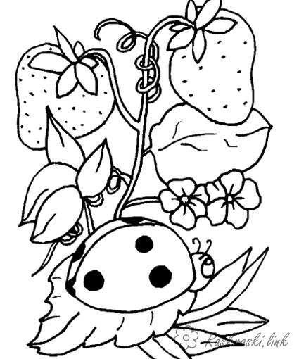Божа корівка і полунички. Раскраска дитячі розмальовки, комахи, сонечко, полуниця, полунички, рослини, ягоди завантажити бесплатно онлайн