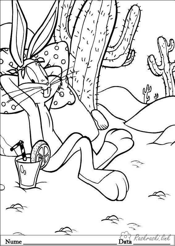Заєць Банні на відпочинку. Раскраска Дитячі розмальовки, природа, відпочинок, відпочинок на природі, кактус, заєць завантажити бесплатно онлайн