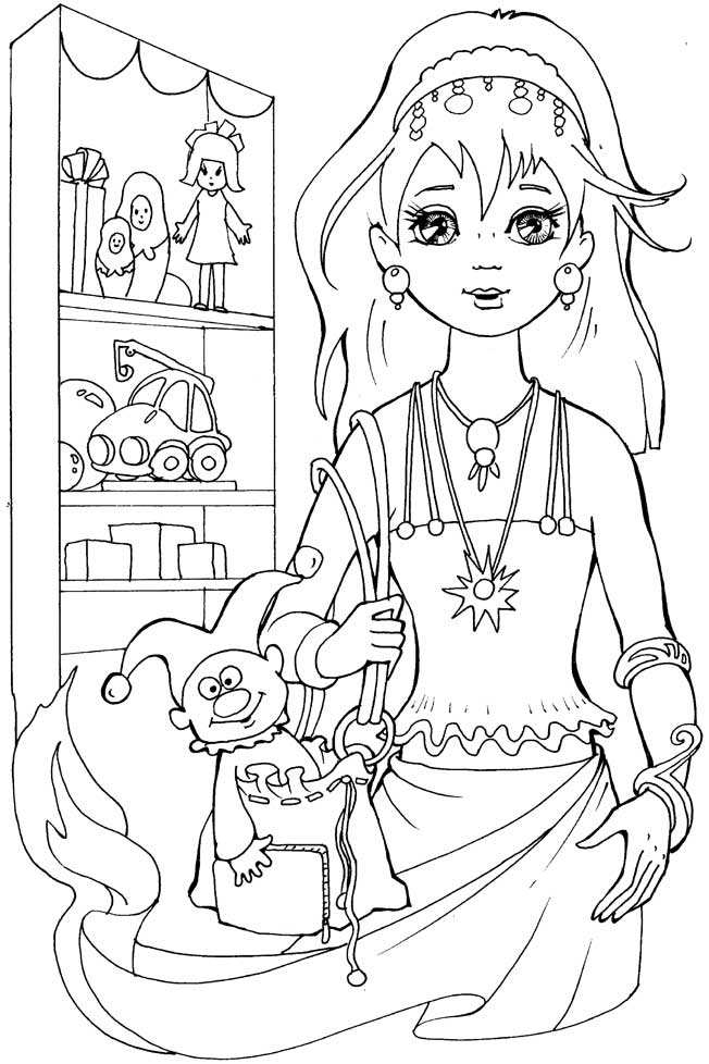 Дівчинка і клоун. Раскраска Дівчаткам, дівчинка, клоун, іграшка, зачіска, прикраси завантажити бесплатно онлайн