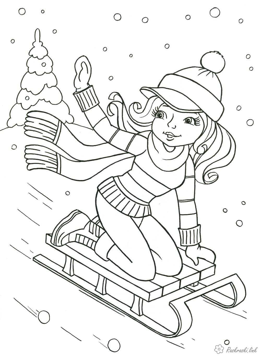 Зима. Раскраска Дівчаткам, дівчинка, зима, санки, гра завантажити бесплатно онлайн