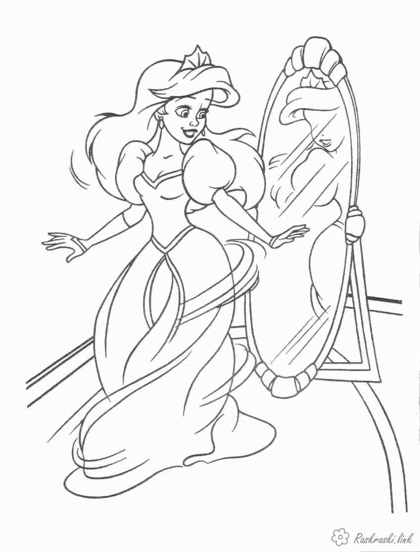 Аріель дивиться в дзеркало. Раскраска розмальовки, розмальовки дівчаткам, Аріель, дисней, дзеркало, відображення завантажити бесплатно онлайн