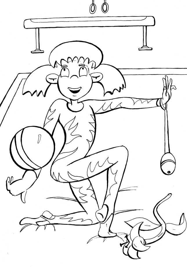 дівчинка гімнастка. Раскраска гімнастика, дівчинка, м'яч, спорт завантажити бесплатно онлайн