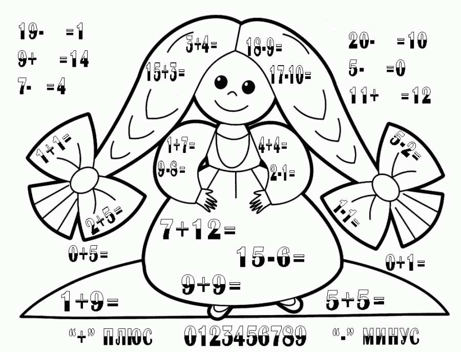 Виріши приклади і розфарбуй дівчинку. Раскраска математичні розмальовки для дошкільнят, навчальні розмальовки, виріши приклади, дівчинка завантажити бесплатно онлайн