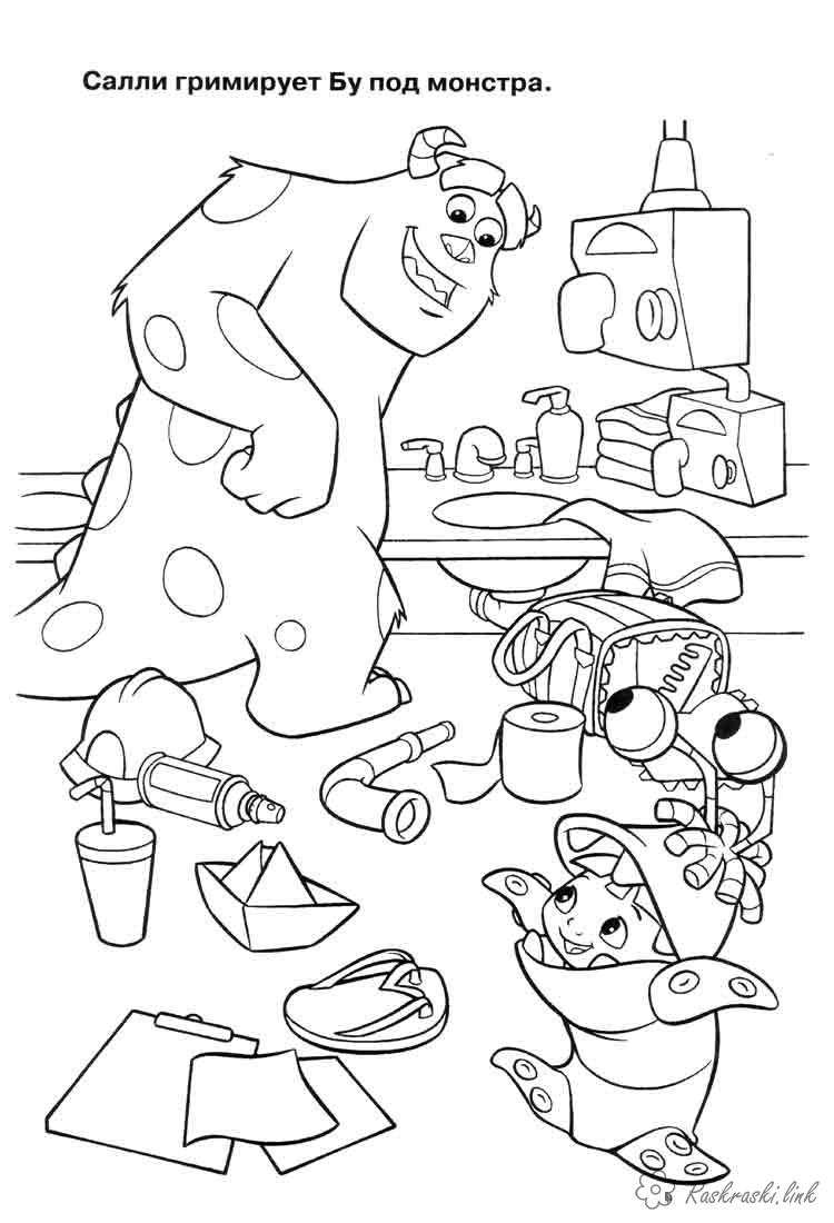 Саллі гримує Бу під монстра. Раскраска Корпорація монстрів, Бу, Саллі завантажити бесплатно онлайн