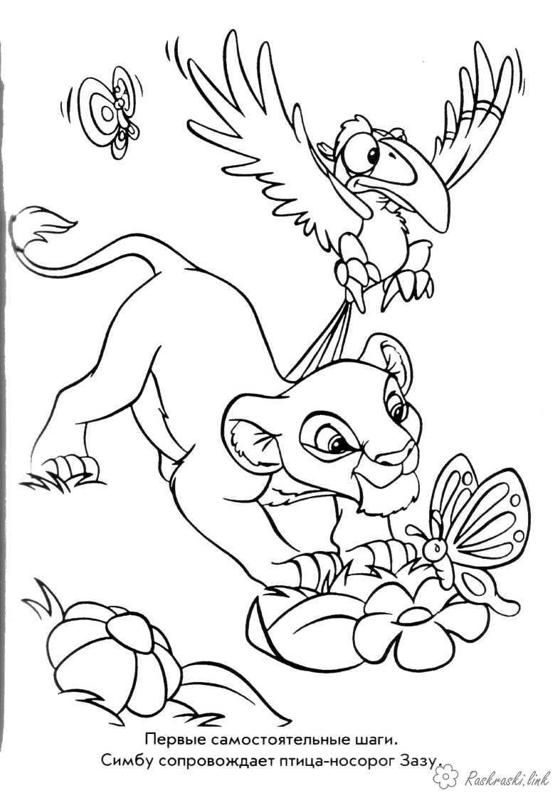 Перші кроки Сімби з друзями. Раскраска Сімба, король лев. птах, дисней, розмальовки завантажити бесплатно онлайн
