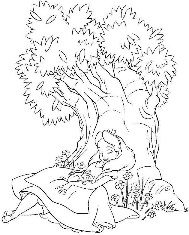 Аліса спить під деревом. Раскраска Розмальовки, Аліса в країні чудес, Уолт Дісней завантажити бесплатно онлайн