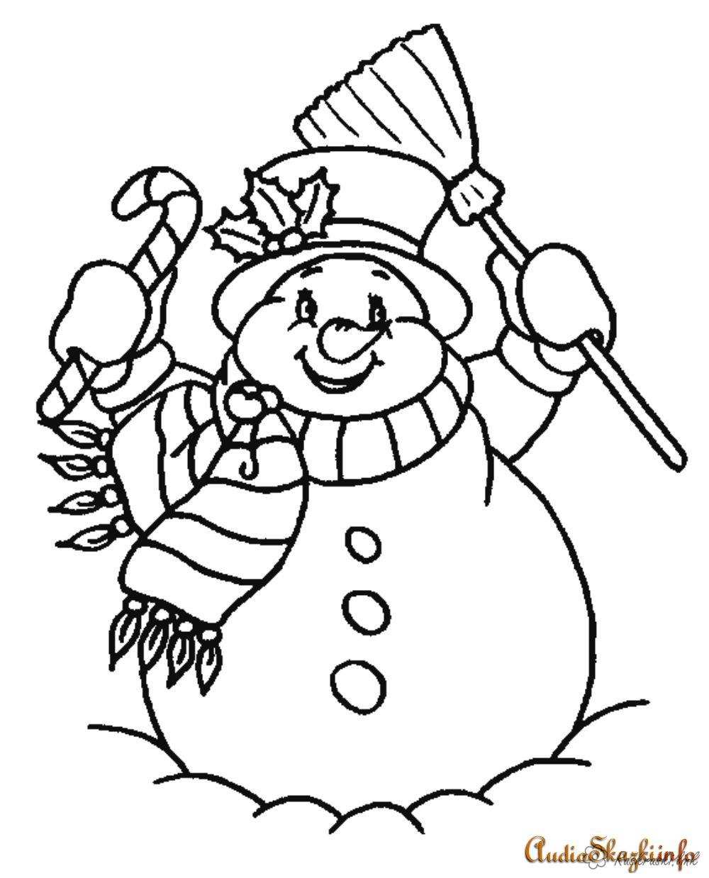 радісний сніговик. Раскраска розмальовки дітям, чорно-білі картинки, новий рік, свято, зима, сніговик, мітла, волоть завантажити бесплатно онлайн