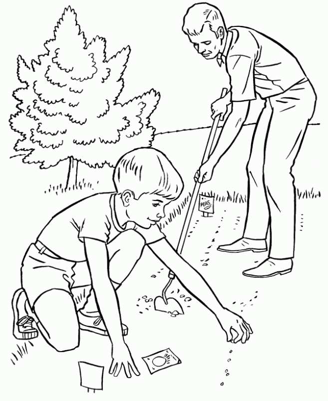 Папа і син садять квіти. Раскраска Розмальовки свята, розмальовки 1 червня, чоловік, тато, хлопчик завантажити бесплатно онлайн