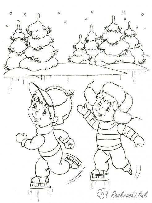 Діти на ковзанах. Раскраска Дитячі розмальовки, природа, відпочинок, відпочинок на природі, зима, хлопчик на ковзанах, діти, каток завантажити бесплатно онлайн