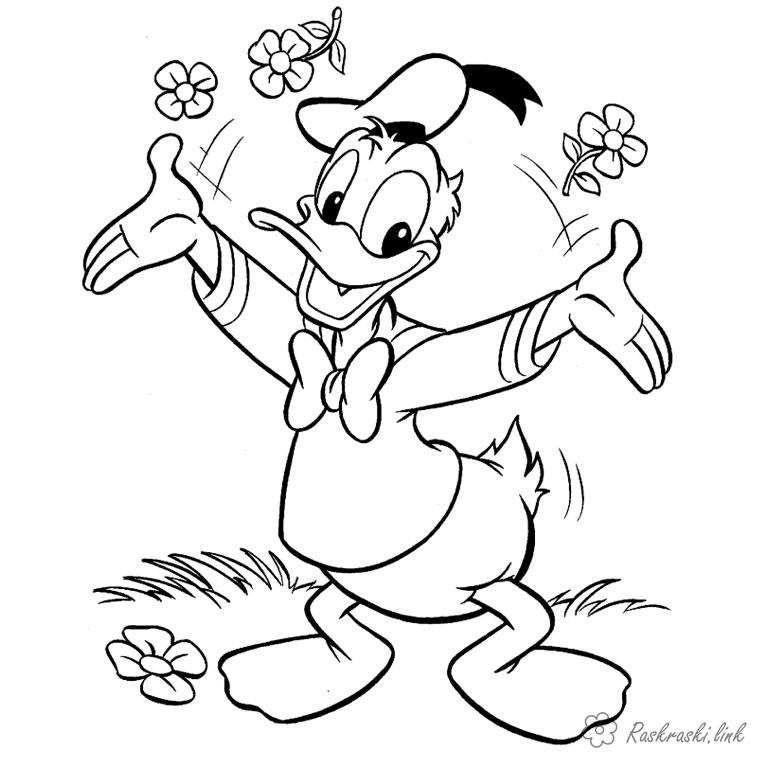 Дональд Дак і квіточки. Раскраска Дональд Дак, квіточки, розмальовки, в капелюсі завантажити бесплатно онлайн