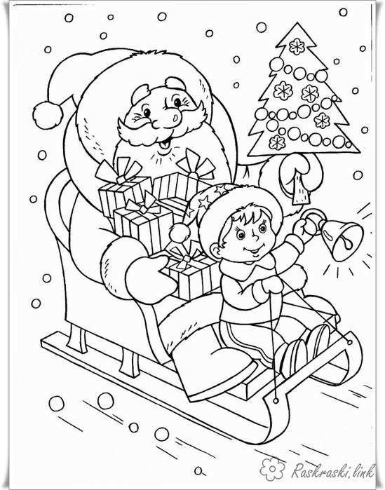 діда мороз з хлопчиком котяться на санях. Раскраска розмальовки дітям, чорно-білі картинки, новий рік, свято, зима, сани, подарунки, дід мороз, хлопчик завантажити бесплатно онлайн