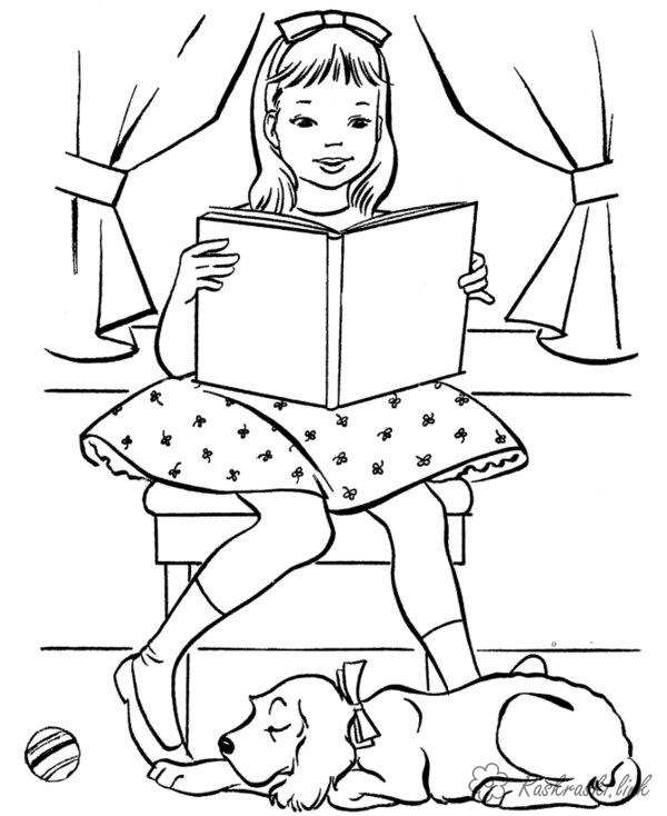 Дівчинка читає книгу. Раскраска дівчинка, книга, собака, читати, розфарбувати завантажити бесплатно онлайн