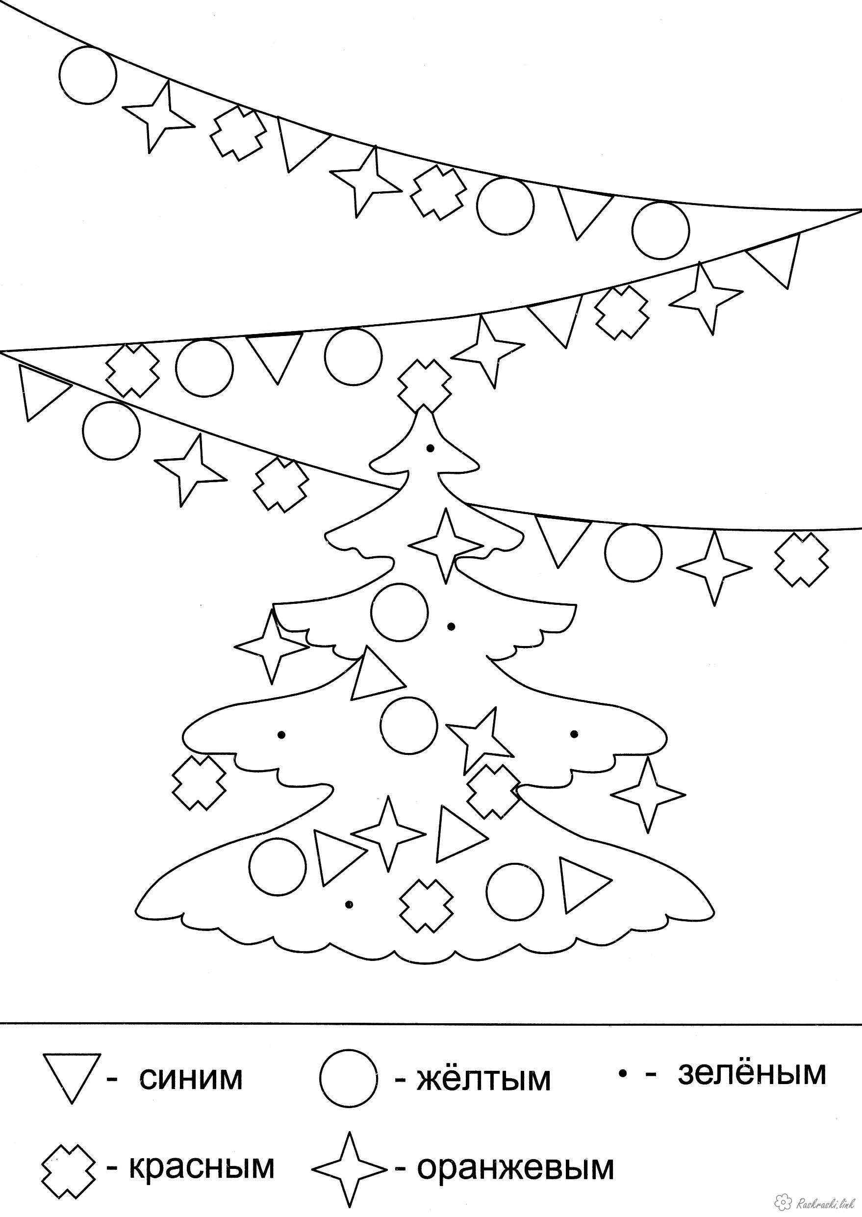 Розмальовка ялинка з гірляндами . Раскраска Розфарбуй ялинку по фігурам. Однакові фігури одним кольором завантажити бесплатно онлайн