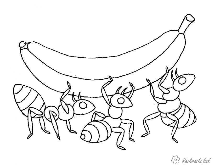 Розмальовка мурахи несуть банан. Раскраска Комахи, мураха, мурашки, банан завантажити бесплатно онлайн