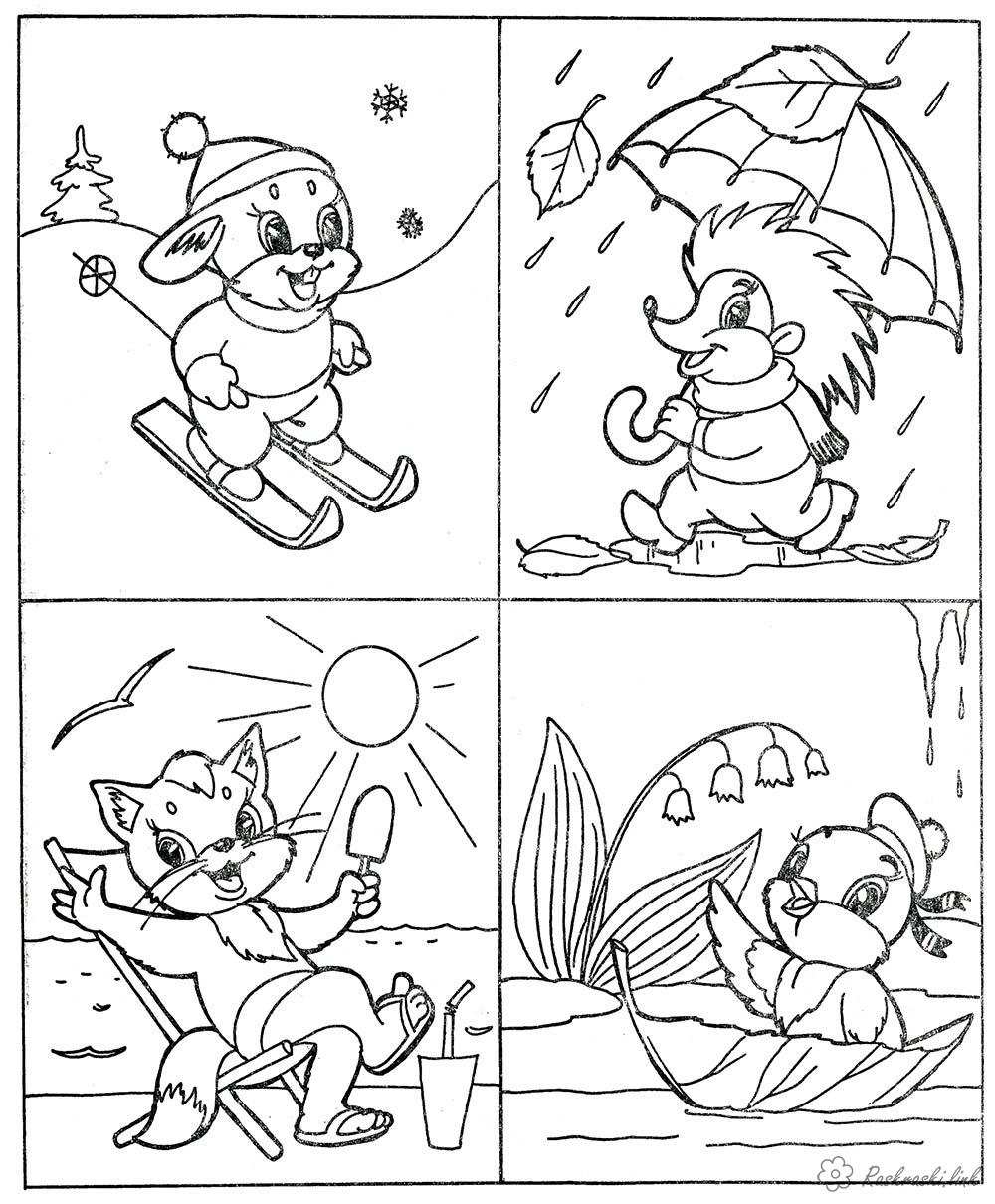 Розмальовка пори року. Раскраска Явища природи, пори року, зима, весна, літо, осінь, заєць, їжачок, лисичка, курча завантажити бесплатно онлайн
