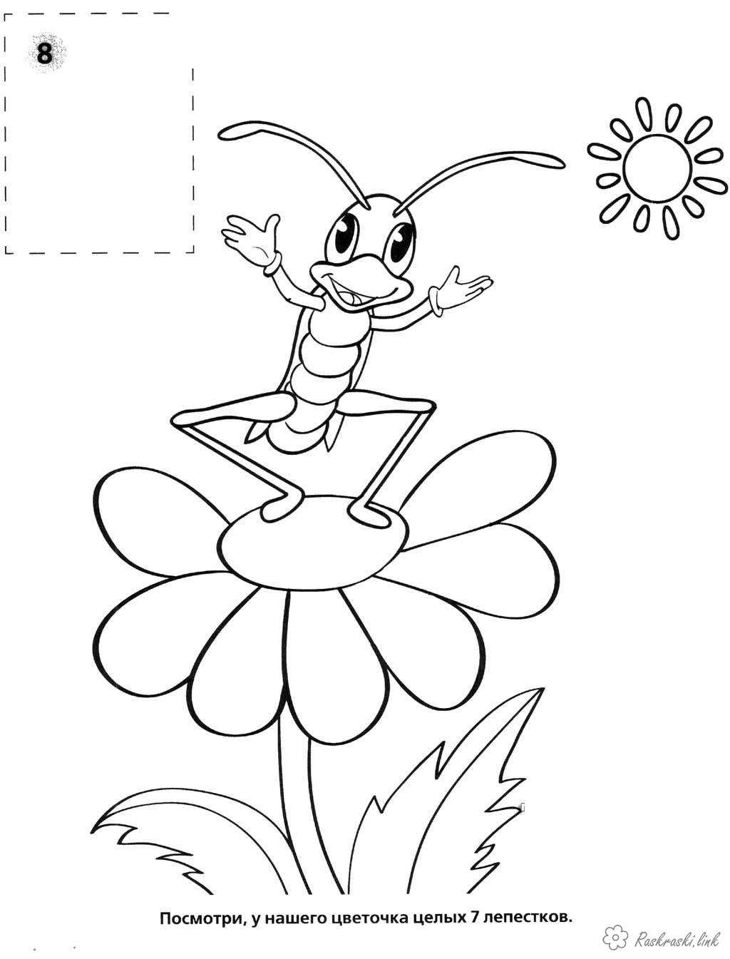 Коник на квітці. Раскраска Коник на квітці сьомій пелюсток і сонце завантажити бесплатно онлайн