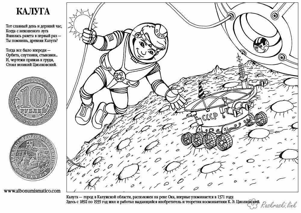 Калуга. Раскраска розмальовки День Росії, розмальовки Росія, космонавт, космос, скафандр завантажити бесплатно онлайн