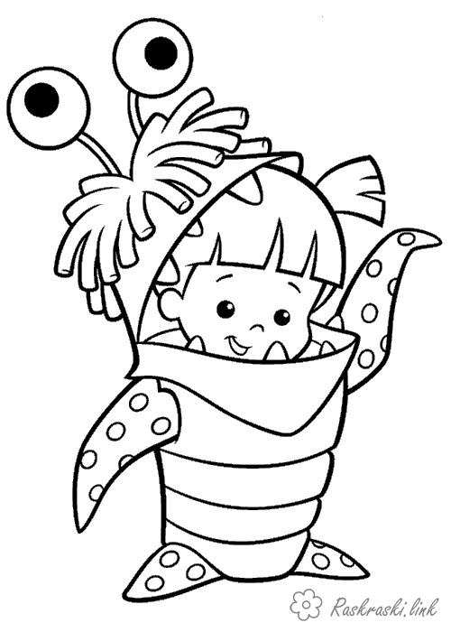 Розмальовка дівчинка Бу в костюмі монстра. Раскраска Корпорація монстрів, дитина, дівчинка, Бу завантажити бесплатно онлайн