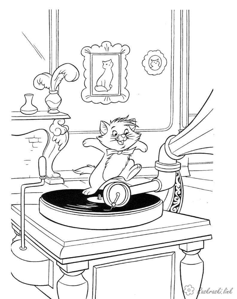 Кот аристократ на платівці. Раскраска кіт, кошеня, пластинка, грамофон завантажити бесплатно онлайн