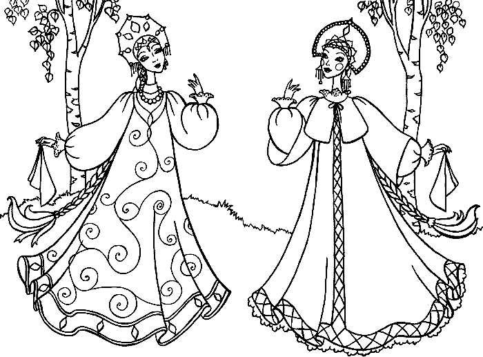Російські красуні. Раскраска Дитячі розмальовки, природа, відпочинок, відпочинок на природі, дівчата, російський національний костюм, дівчинка, дівчинка в сукні завантажити бесплатно онлайн
