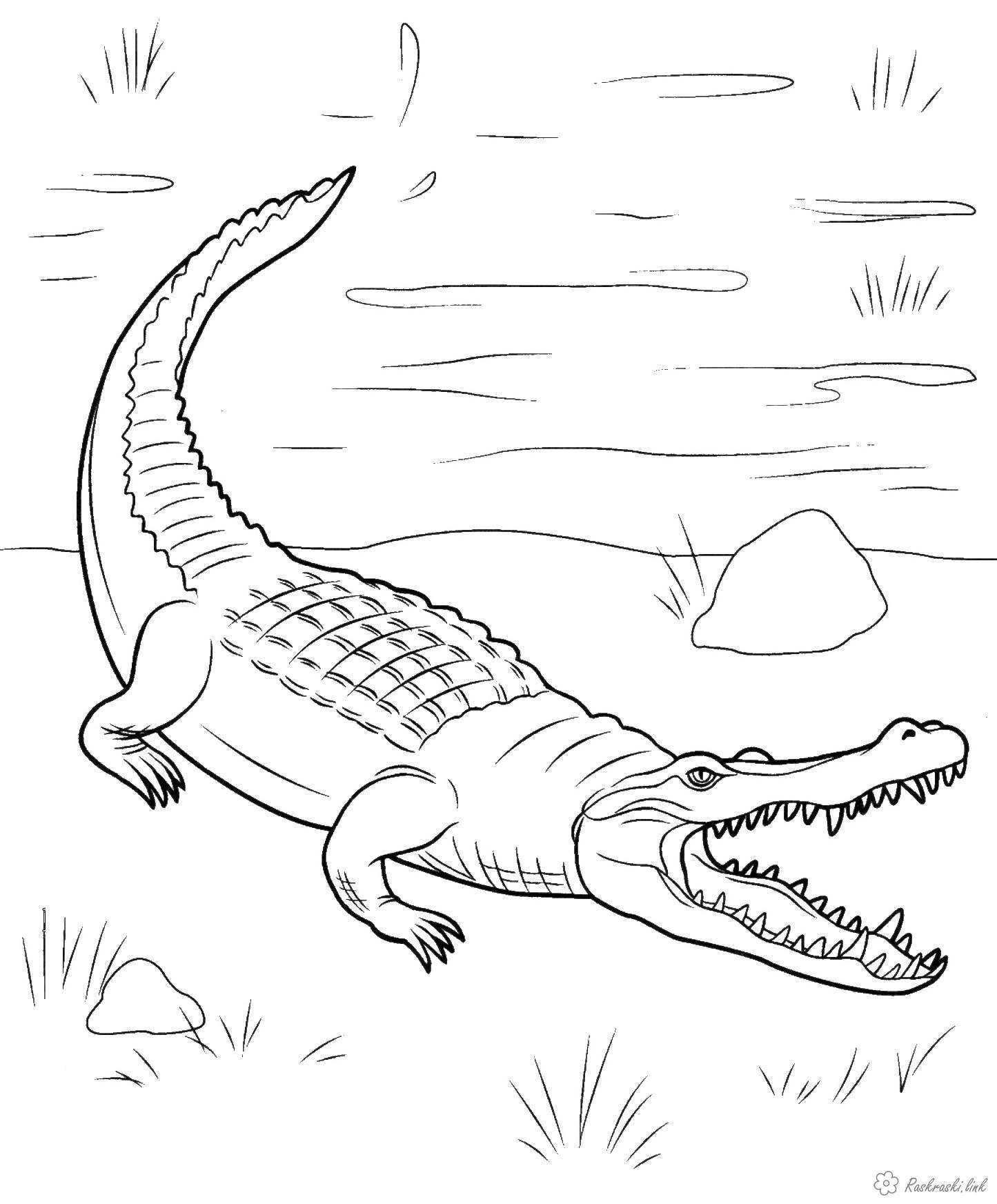 Розмальовка крокодил на березі. Раскраска Рептилії, крокодил, вода завантажити бесплатно онлайн