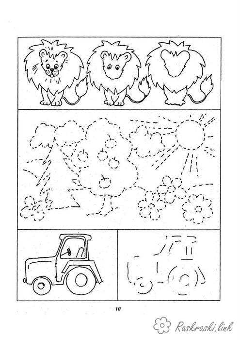Лев, ліс, трактор. Раскраска домалюй і розфарбуй, лев, ліс, трактор завантажити бесплатно онлайн